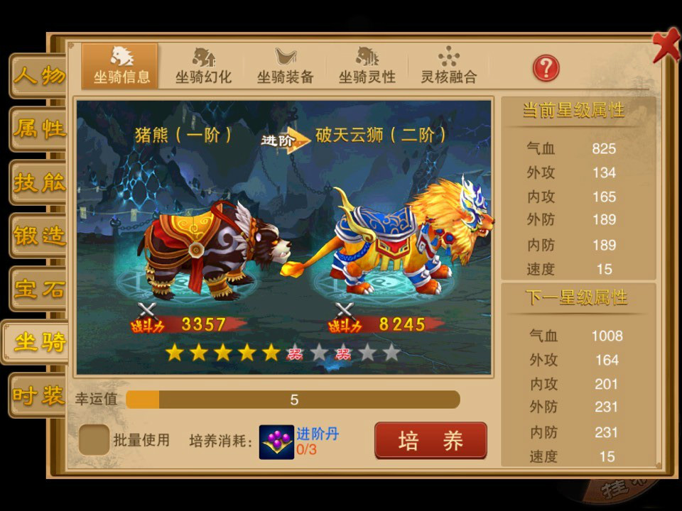 有武侠梦的人都想在武侠世界中有一款属于自己的“香车宝马”,身骑白马,闯荡江湖这样快哉的生活!在游戏中,不乏“呆萌”的各式坐骑等你来驯服!坐骑需要通过任务获取,得到坐骑后,在坐骑模式中可以看到坐骑的信息,使用进阶丹可对坐骑进行培养,坐骑每满10星则升级为下一阶。然后是坐骑的幻化,每一阶级的坐骑都有一个外形,当对应阶级的外形被激活后,可以幻化为对应阶级的形象。