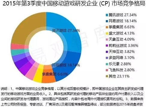 根据此前发布的报告显示,在2015年第3季度,中国移动游戏研发企业中,腾讯游戏和网易游戏合计占据45%的市场份额,已经形成双寡头垄断的市场竞争格局。其中,网易凭借3月上线的《梦幻西游》和9月推出的《大话西游》实现收入的大幅增长,市场份额提升至18.14%。