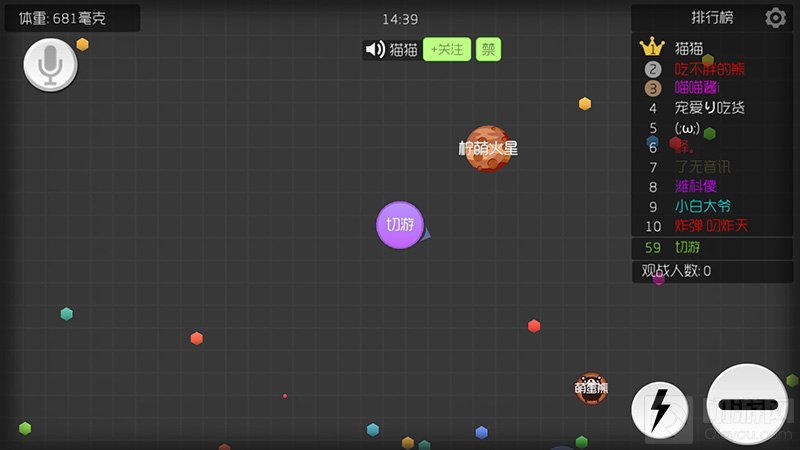 2) 实在避无可避的时候,还可以吐出精华缩小自己的体积来达到一定的加速效果,不过一定要注意好吐精华或分裂分身位置,绝对不能羊入虎口,但这是对方的体积比自己大的不会太多的情况下,如果他分裂出来的分身都比你要大,你就不容易逃脱了。