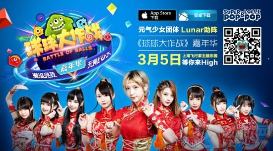 《球球大作战》嘉年华于3月5日在上海飞行家主题乐园正式开幕,届时亚洲最潮男主持李晨nic、新加坡偶像团体BY2、元气少女组合Lunar以及众多网络红人都将出席此次“潮流竞技”的盛典,而今日,嘉年华主办方正式公布Lunar将为《球球大作战》献唱一首原创歌曲。