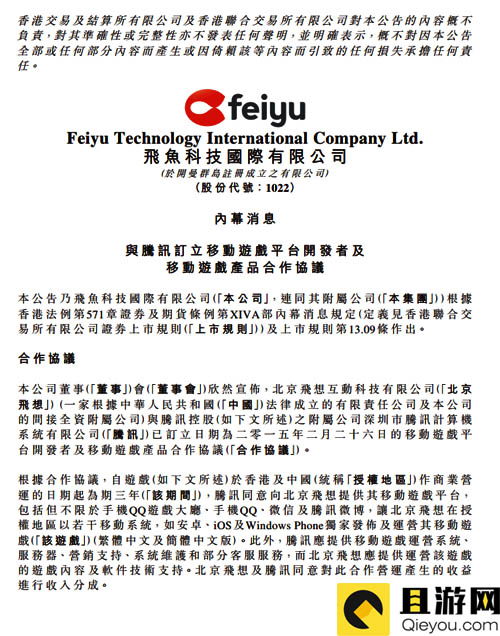 公告中提到飞鱼全资子公司北京飞想研发的一款游戏(包括简体版和繁体版)将由腾讯在中国大陆和香港地区在Android、iOS及Windows Phone等移动平台独家发布及运营,为期三年。腾讯将向飞鱼科技提供移动游戏平台,包括但不限于手机QQ游戏大厅、手机QQ、微信和腾讯微博。北京飞想将提供游戏内容和软件支持。飞想和腾讯均同意对此运营合作产生的收益进行分成,但是却未提及分成比例及方式。