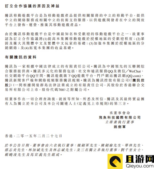 切游网2月27日讯 上市公司飞鱼科技在港交所发布公告,称其已与腾讯签订“移动游戏平台开发者及移动游戏产品合作协议”,今后,飞鱼科技将为腾讯提供产品,而腾讯则为飞鱼提供平台。