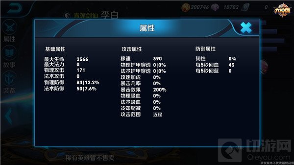 在《王者荣耀》中,英雄李白被定位为刺客/收割型英雄,仿佛就像是第二个宫本武藏。对于李白而言,他的生存能力与其他刺客相比来说属于平衡。但是在攻击伤害和技能效果方面却占据优势,上手难度也是较高,这需要玩家们不断练习去找到一定的技巧。在李白的基础属性方面,物理攻击高达171,最大生命值达到2566点,移速390,可见他生存能力虽不强却胜在攻击力高和灵活,物理防御和法术防御皆是普通属性。