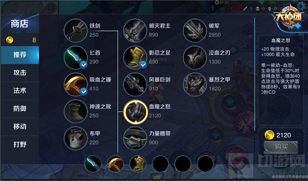 血魔之怒是攻防一体的强力装备,虽然基本属性仅有20点物理攻击的附加,但是却有高达1000生命值的加成可全面提高玩家的生存能力,并且其被动效果在血量低于30%时触发,不但增加较多攻击力,更拥有一个强大的护盾,让李白在追杀敌人或者逃跑过程中更不容易被杀死;泣血之刃可以为李白提高100点物理攻击力,更让李白拥有25%的吸血能力,让其在攻击过程中可以有效回复生命。