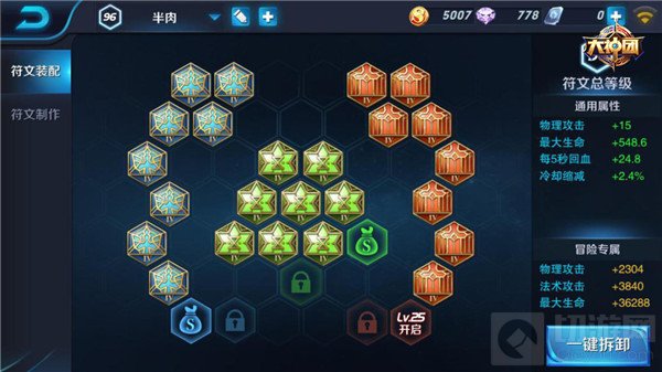 全套符文(30个)总属性:物理攻击+32,最大生命值+975,每5秒回血+45,冷却缩短+6%。