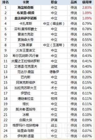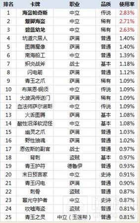 帕奇斯和蹩脚海盗毫无疑问登上使用率最高的卡牌,而经典的经典卡碧蓝幼龙也以超高的总使用率位列第三,怪不得BB想要动刀子。后续大部分都是萨满的单卡,萨满:中立是哪个家伙?敢和我叫板!