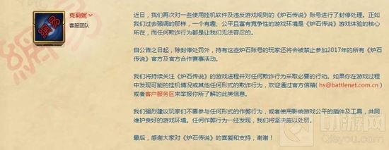 自公告之日起,除封停处罚外,持有这些炉石账号的玩家还将会被禁止参加2017年的所有《炉石传说》官方及官方合作赛事活动。