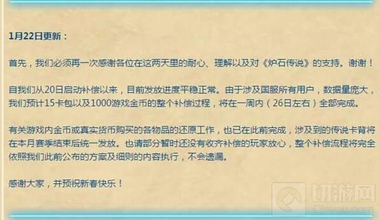自我们从20日启动补偿以来,目前发放进度平稳正常。由于涉及国服所有用户,数据量庞大,我们预计15卡包以及1000游戏金币的整个补偿过程,将在一周内(26日左右)全部完成。