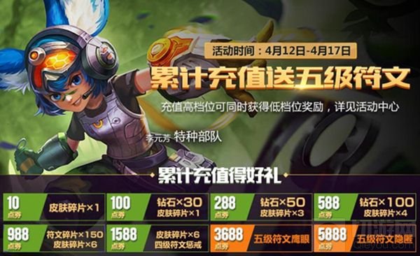 版本更新后,累计充值送钻石,皮肤碎片,高级符文!