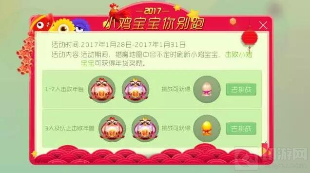 活动内容:活动期间,猎魔地图中会不定时刷新小鸡宝宝,击败小鸡宝宝可获得年货奖励!