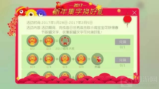 活动内容:活动期间,完成每日任务或击败小鸡宝宝可获得春节祝福文字,收集祝福文字可兑换好礼!