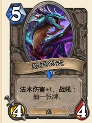 3、战吼改亡语。其实亡语把即时过牌延后也是不错的改法,这样也避免后期双方抽一打一后,谁先摸到碧蓝幼龙谁抽打出2张立刻优势的局面,尤其萨满、贼使用经常遇到这类局面。