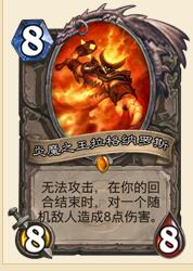 炎魔之王拉格纳罗斯压制了其他8费随从的选择,虽然没有碰碰博士那么强的竞争力,但是设计师都亲口提到了,所以这牌退环境概率很大,同样效果完美,身材平衡,就是随机性大了一点。