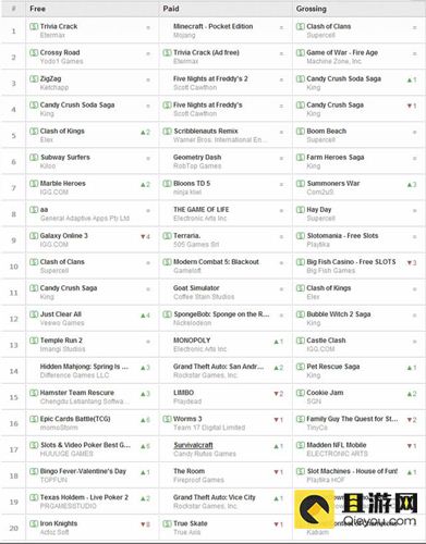 免费游戏排行榜方面,《冷知识大王》与《天天过马路》仍然分别垄断了第一名和第二名,不过,由Ketchapp的《疾行转弯》(ZigZag)上周还只排在第二十名,本周却已经取代《aa》成为了第三名。《糖果粉碎苏打传奇》仍然还是本周免费游戏排行榜的第四名,但是上周排名第六的《诸王争霸》与上周排名第五的《地铁跑酷》(Subway Surfers)本周则互换了排名顺序。