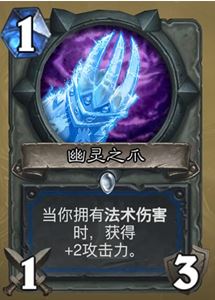 幽灵之爪是萨满的一个显而易见的强大武器。作为1费卡,幽灵之爪可以配合血法师萨尔诺斯或者萨满的英雄技能,来极为有效的利用法力曲线的同时还能解决对面的随从。把它的法力消耗增加1点可以让这张牌不再能有效的利用法力曲线,从而减慢整套卡组的速度。