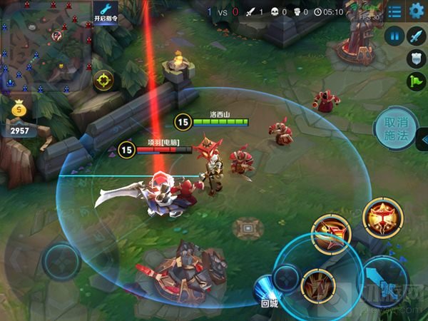 这个技能是指向性切入技能,很多新手小伙伴们在使用这个技能的时候不知道就飞哪去了,其实老夫子的这个技能使用是有技巧的,想打谁就打谁不是说着玩的,主要就是在施放这个技能的时候按住技能不松,就会出现下图这样的情况,这个时候红线在谁的头上松开技能老夫子就会跳向谁。