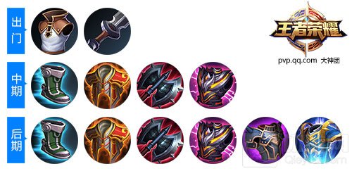 这样的出装主要强化了典韦的血量及防御力,因为游戏进行到中期时,团战的战火随时会点燃。装备附加的生命值能让典韦冲入战线也不会太不经打,同时黑色战斧和暴烈之甲除了提升生命值外,附带的攻击力也能提高典韦的输出能力。同时这两件装备所附带的被动也使典韦在面对防高血厚的坦克型英雄时,输出能力不会被大幅度减弱。
