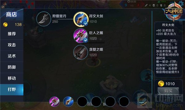 嬴政打野出门装为狩猎宽刃,增加对野怪的伤害能力。然后通过打野来获取金币,将打野装备升级为符文大剑。符文大剑可增加对野怪的伤害增加30%和击杀野怪获得的经验提高30%外,还可增加法攻和法术值,并且让嬴政在释放过技能后,普攻额外附带法术伤害。该装备可谓是让嬴政普攻发挥的输出更加淋漓尽致的御用装备,嬴政的普攻可以对敌人造成穿透效果,具有群攻性,符文大剑的效果让其普攻的输出附带额外的法术伤害,更添一分嬴政的清野速度。嬴政清野主要通过普攻和王者惩戒的群攻技能,来快速清理野怪。