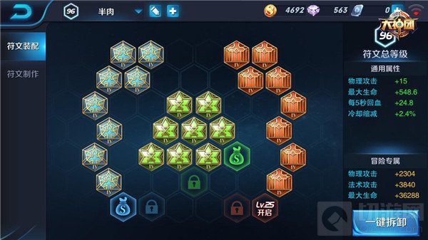 全套符文(30个)总属性:物理攻击+21,最大生命值+652,每5秒回血+31,冷却缩短+0.3%。