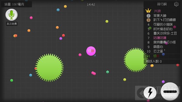 当你的球体积大于绿刺的话,通过齿轮一定会被炸开从而分成很多个小球,但是如果你的体积小于或者和绿刺大小差不多,你就不会被分割,不过你就可以慢慢吃这些刺,唯有一点需要注意的就是随时注意周边的动静,看看是不是有人想要趁你吞刺的时候,吃掉你。