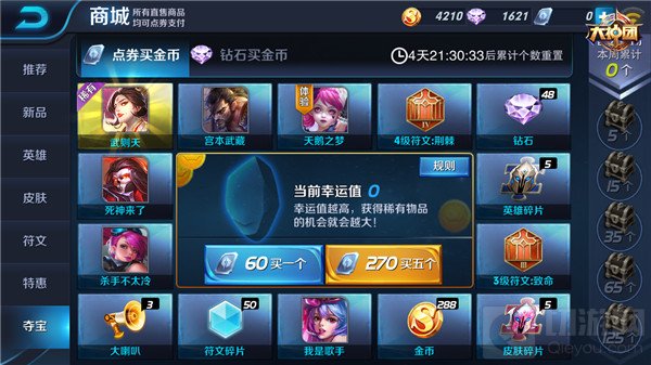 说下特殊的两个英雄,韩信和武则天,只能通过幸运夺宝获得,所以这个点劵和钻石的必花的。不够也并非没有小技巧,就是每周的奖池物品会更新。在进行夺宝前,看看奖池里的其他商品是否为未拥有的,如果未拥有的商品过多,就不妨参与这周的夺宝,在中大奖前也能把其他未曾拥有的商品收入囊中,也算是省掉另外花销的费用。