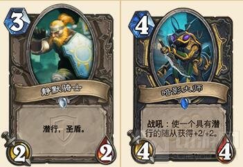 本套卡组与之前原版的不同点想必大家已经发现了,没错——潜行。暗影大师和沉默的骑士的加入,使得整副套牌变得更加有趣,两张看似鸡肋的卡牌在快攻陨落的加基森版本末期会显得尤为强大。