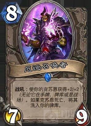 如果是把克苏恩洗回牌库的话,那么厄运召唤者无疑是一张好牌。克苏恩的强大之处就在于其强大的战吼效果,用来斩杀或者返场都非常优秀。