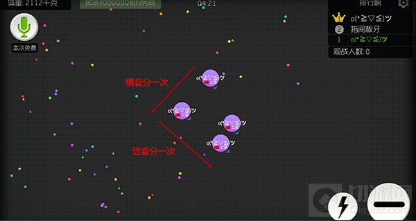 1)在队友足够大的时候向队友方向分身两次,也就会形成四个分身,然后再点一下屏幕,再按分身,这样就可以快速合体。