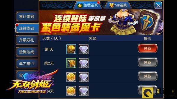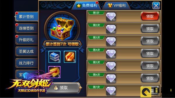 《无双剑姬》为玩家准备了丰厚的免费福利,每天登录游戏后,首先去签到领取累计签到和连续签到奖励。每日的炼金活动第一次是免费的哦,点一下就可以领取金币,千万不能错过。另外每天还有在线奖励,在游戏的过程中,就可以通过不断的在线累积时间来领取在线奖励。