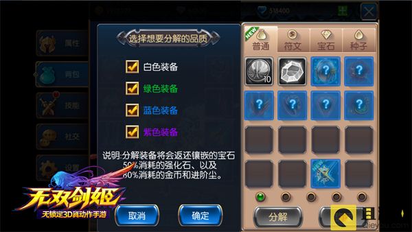 《无双剑姬》所有的装备都可以进行分解。在背包中点击装备弹出道具说明,点击说明右下方的“分解”按钮,点击确认即可分解装备。分解后装备消失,但可以获得金币,还有几率获得强化石或者完美强化石,这些是高级装备强化的必需道具。