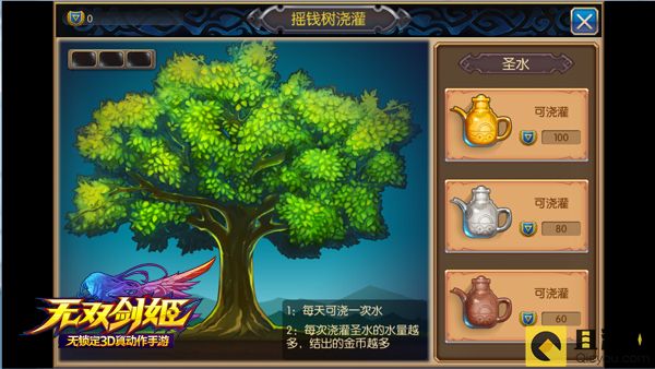 公会升到二级后,姬友们可以在公会NPC中点摇钱树自动寻路,每天都可以给摇钱树浇一次水,同时可以获得大量金币,当摇钱树左上角的进度条满了之后,还可以收获更多的金币哦。