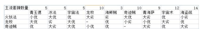 (海盗战,青玉萨,龙牧,火妖法,达人奇迹贼),思路BAN海盗战,很好抓德鲁伊、宇宙法,小抓奇迹贼;但除了火妖不好打冰法,打青海萨、龙牧总体劣势;打宇宙术55开。