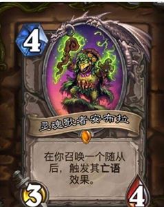 大家好,今天小编为大家带来炉石新卡灵魂歌者安布拉的相关介绍,这是一张能实现战吼+亡语的卡牌,这样亡语就能触发两次了,说起来其实这种套路早就应该有了,不过为时不晚,好评!