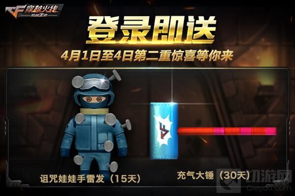 4月1日至4日,登录游戏除了以上礼包之外,更有第二重惊喜来点燃你的游戏热情,全新诅咒娃娃手雷(15天)和充气大锤(30天)免费送给你。
