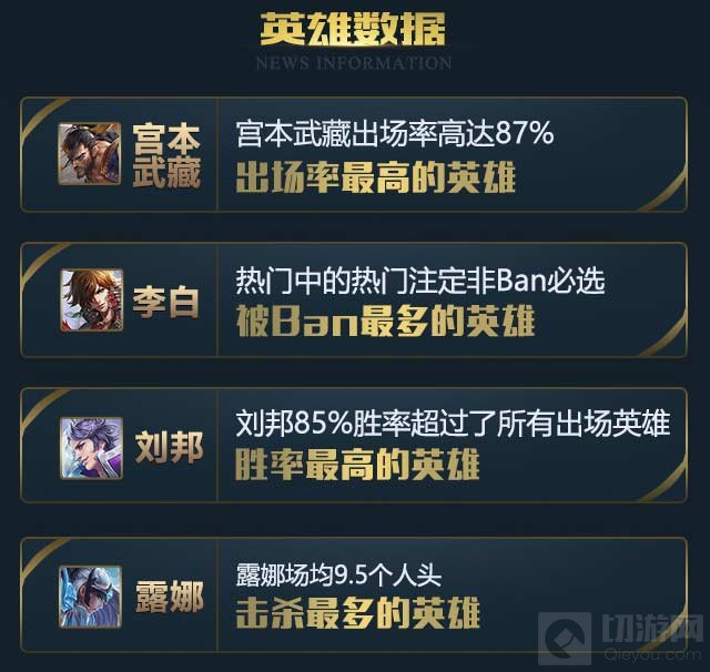 出场率最高的英雄是宫本武藏,高达87%,而最受欢迎的英雄则是李白。刘邦的胜率达到85%超过了其他所有出场英雄,场均9.5个人头的露娜则成为击杀最多的英雄。