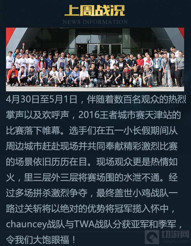 4月30-5月1日,伴随着数百名观众的热烈掌声以及欢呼声,2016王者城市赛天津站的比赛完美收官。选手们在五一小长假期间从周边城市赶赴现场并共同奉献精彩激烈比赛的场景依旧历历在目。现场观众更是热情如火,里三层外三层将赛场围得水泄不通。经过多场拼杀与角逐,最终盖世小鸡战队一路过关斩将,以绝对的优势赢得天津站的冠军,chauncey战队与TWA战队分别荣获亚军与季军,令我们大饱眼福!