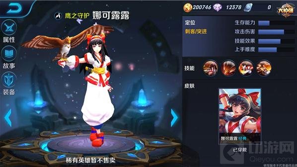 娜可露露是一个机动性非常高的刺客英雄,有位移、有加速技能。1技能会对敌人施加鹰眼标记,配合普攻或者技能都能触发高额伤害,而且还能缩减该技能的时间和恢复法力值,是娜露可可的主要伤害技能。2技能是个位移技能且技能CD短,既能对一条直径上的敌人造成伤害来回复生命值,同样可以作为逃跑的手段。1、2技能能够配合使用,先1技能施加标记,配合2技能的冲刺就能打出爆发伤害。大招则是召唤鹰协同作战,能够获得大幅度移速加成,二次释放可以对指定区域造成伤害和减速,算是一个收割技能。但值得注意的是,使用大招后的娜可露露是腾空状态,无法使用1、2技能。