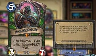 3.金手指卡努克。已更名为“金手指纳克斯”,同时由于金手指的攻击特效并不是在攻击一名随从后,再次对玩家进行攻击,而是释放出一个类似与致命打击的弹道,因此将卡牌描述中的“攻击”改为了“命中”。