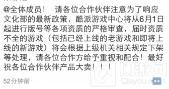 友情提示:在游戏上线30天内及时做报备工作,且在报备的联合运营方中加入,如酷派、金立等合作平台。切记!所有相关工作务必在5月31日前完成,6月1日起未达成的游戏将按照法律法规做下线处理。