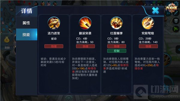 【翻滚突袭】:孙尚香朝前放翻滚,并强化下一次普攻,对一条直线敌人造成物理伤害(附近有敌方英雄将获得 短暂大量移速加成)