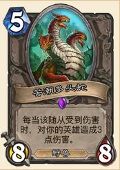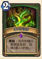 毒蛇陷阱这张卡很强,原来我只想带张实验下,结果它产生的效益很出色。很多时候,对方都会默认你是冰冻或爆炸,结果出了三只小毒蛇,而且可buff可用来解场,甚至配合飞刀心理战起到返场的作用。另外525的苔原犀牛,天梯里表现也很惊艳,大多时候对面解不掉,现在猎人的随从攻击频率都很高,带一张绝对会给你惊喜。