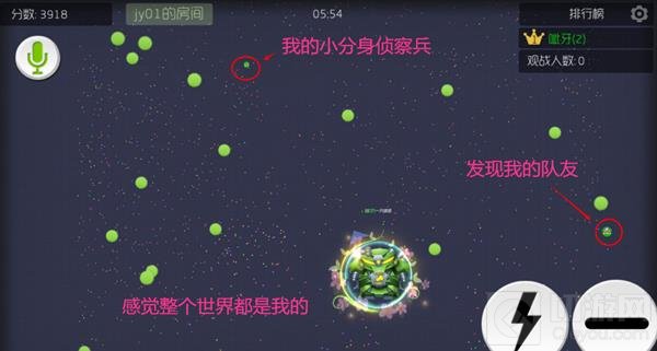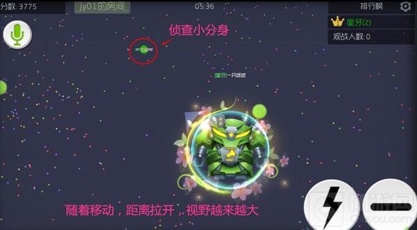 技巧讲解:球球地图是一个非常的空间,我们所看到的视野终归是冰山一角,接下来我们利用游戏内的设定---一个玩家的所有分身会全部显示我们的可见范围的原理制作侦查兵来扩大可视范围。