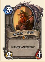 布莱恩·铜须的费用低廉,这也进一步降低了COMBO的难度。在狂野的牌池深度的影响下,他将非常容易作为各种思路的COMBO组件活跃于天梯。 而3/2/4的身材也保证了铜须的下限不算太低(快对铜须说对不起!)。