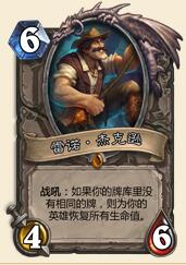 战吼 :如果你的牌库里没有相同的牌,则为你的英雄恢复所有生命值。