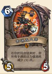 一张牌对应的思路越是简单与核心,他在狂野中能挖掘的潜力就越大 (其实这句话是我从洛欧塞布的评价里复制的ww)。卡牌的潜力与其对应思路关系密切 。而索瑞森大帝所对应的思路则是卡牌的费用,且异能发挥受到手牌数目和构筑思路影响。对于常规的控制思路而言(不谈TEAM5理想中的的弃牌控制术),保持较多手牌数目是一个常态,因此大帝的异能单从曲线上说就不算弱,并为诸多COMBO提供可能。