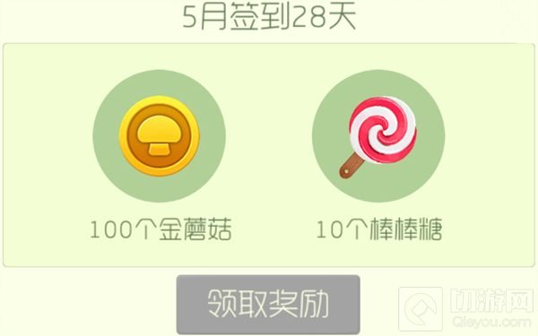 5月连续签到28天,可得100个金蘑菇和10个棒棒糖。