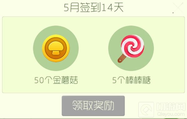 5月连续签到14天,可得50个金蘑菇和5个棒棒糖;