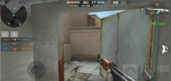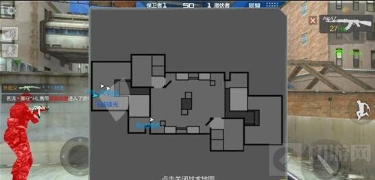 半开大门外的平房墙壁点位具有很好的隐蔽性,而且它还是敌人整个左路进攻的盲区点位,它和敌人左路的进攻通道呈90度的视觉死角,所以这个点位是左路中唯一的阴人埋伏点位。虽然这个点位可以运用于埋伏作战,但是这个点位对于右路来说却是无遮无拦,而且也没有足够大的走位空间,从而直接导致它很容易遭到到来自右路敌人的多点围攻。
