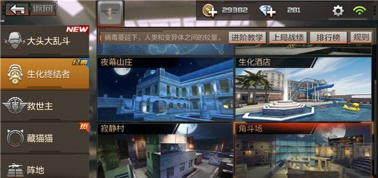 生化终结者模式属于休闲模式,所以我们在《枪战王者》的游戏主界面中选择“休闲”大项,并在左侧的菜单选择“生化终结者”,就可以看到如上图所示的地图选择画面。我们选择今天的主角地图“角斗场”,点击单人匹配,就可以进入到游戏的载入画面。