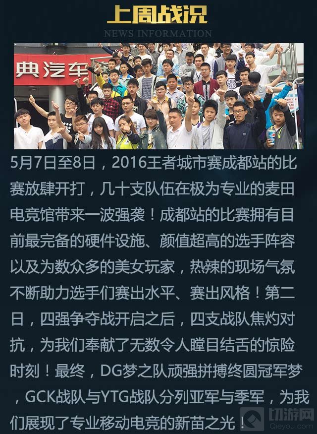 5月7日至5月8日,2016王者城市赛成都站的比赛放肆开打,几十支队伍在极为专业的麦田电竞馆带来一波强袭!成都站的比赛拥有目前最完备的硬件设施、颜值超高的选手阵容以及为数众多的美女玩家,热辣的现场氛围不断助力选手们赛出水平、赛出风格!第二日,四强争夺战开启之后,四支队伍焦灼对抗,为我们奉献了无数令人瞠目结舌的惊险时刻!最终,DG梦之队顽强拼搏终圆冠军梦,GCK战队与YTG战队分列亚军与季军,为我们展现了专业移动电竞的新苗之光!
